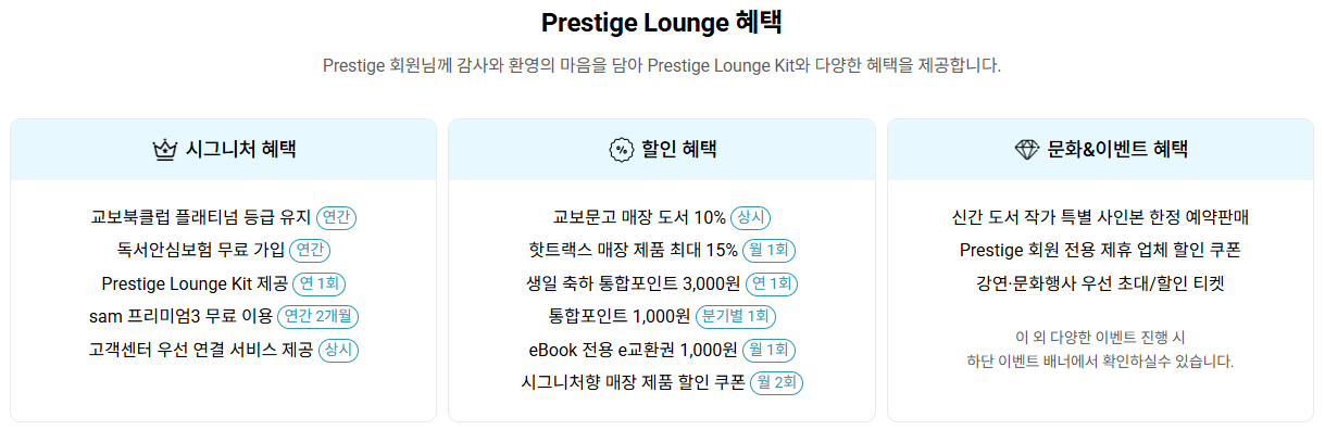 프레스티지 라운지 키트, 교보문고 매장 10% 상시 할인, 플래티넘 등급 유지, 전용 이벤트와 신간 사인본 예약 등 오직 프레스티지 회원만이 누릴 수 있는 특별한 혜택이 준비되어 있죠.