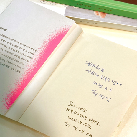 명진: 저에게 책은 생활의 중심이자 가장 큰 즐거움이라, 작가님이 제 이름을 친필로 적어주는 '사인본 이벤트'가 제일 좋았어요. 더 많은 도서가 혜택 도서로 지정되면 좋겠지만, 지금 제공되는 도서들도 이미 많은 화제를 모은 책들이라 충분히 만족합니다.