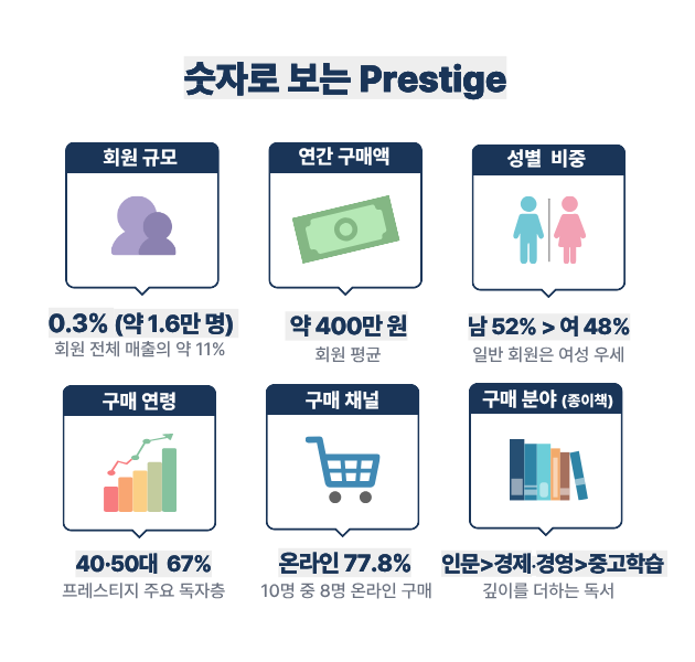 프레스티지 회원은 교보북클럽 전체의 단 0.3%에 불과하지만, 회원 매출의 11%를 책임지는 핵심 독자층입니다. 연간 약 400만 원을 책에 투자하며, ‘책에 가장 진심인 독자’라는 이름이 아깝지 않죠.