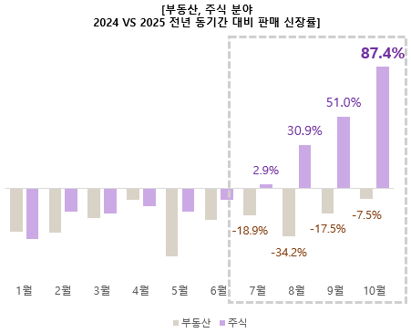 먼저, '주식' 분야 도서는 7월부터 판매가 꾸준히 오르기 시작해, 10월에는 전년 동기간 대비 무려 87.4%라는 폭발적인 성장세를 기록했습니다.