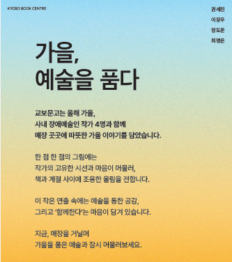 현재 교보문고 전 지점은 행잉과 배너 등으로 가을 분위기를 가득 담아내고 있습니다. 특히 강남점에서는 작가님들의 작품을 갤러리처럼 전시해 고객님들께 색다른 예술 경험을 선사하고 있어요!🍁