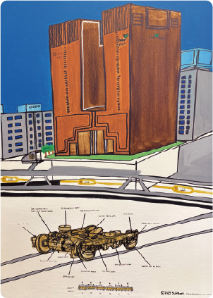 강남교보타워와 신논현역 9호선 부수대차, 권세진 ㅣ2025 Acrylic and Marker on the canvas 72.7x53cm |