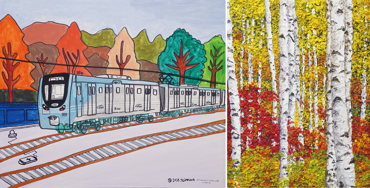 담당자님께서 ‘가을 기차 여행’이라는 주제를 제안해 주셨어요. 한동안 생각만 하던 세진 작가가 어느 날 공항철도를 모티프로 기차 그림을 그리기 시작하더니, 그 속에 단풍 든 가을 풍경을 자연스럽게 녹여냈어요. 바로 세진 작가다운 가을이었죠. 작가도 교보문고 매장을 직접 찾아가 작품이 전시된 모습을 보며 무척 기뻐했고, 세진 작가가 한 계단 더 성장한 걸 느꼈습니다. 올가을은 우리에게 오래 기억될 소중한 시간으로 남을 것 같아요. |